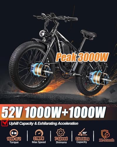 • E·Bycco 2000W Peak 3000W Dual Motor Electric Bike for Adults, 52V 23Ah Battery E-Bicycle, 37MPH & 80Miles, Hydraulic Disc Brake, 26” Fat Tire All Terrain Commuter E-Bike, Front/Full Suspension