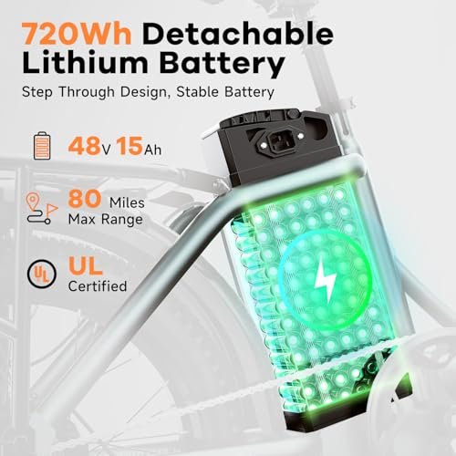 • Folding Electric Bike for Adults with Peak 1000W Motor, 48V 15Ah Large Battery up to 30MPH 80 Miles, 20″ Fat Tire All Terrain Ebike, Front Suspension 7-Speed Commuter E Bike, Step-Thru, UL Certified