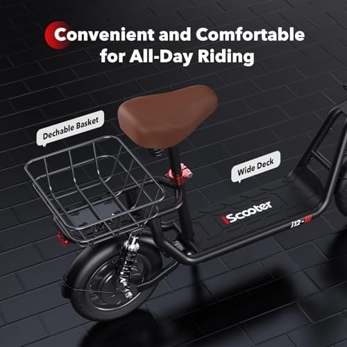 • iScooter Electric Scooter with Seat, 34/21 Miles Long Range & 28/15.6 Mph Top Speed, 14″/12” Pneumatic Tire, Height Adjustable Seat &Handlebar, Dual Suspensions Commuting Scooter with Basket