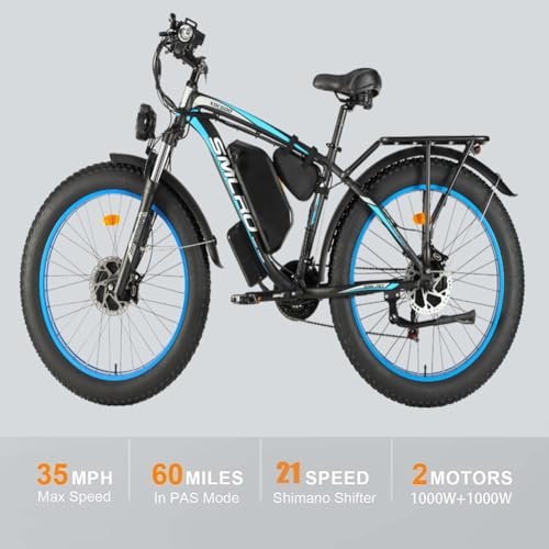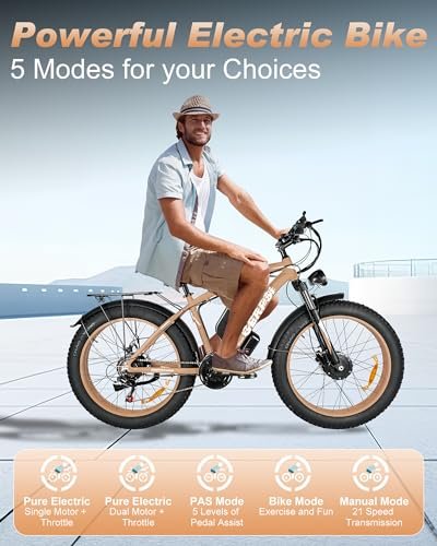 • 2000w Dual Motor Ebike for Adults Electric Bike for Adults 26inches Fat Tire Electric Mountain Bike 48v 23ah Removable Battery Max Speed 34mph 62 Miles Long Range 21-Speed Mens