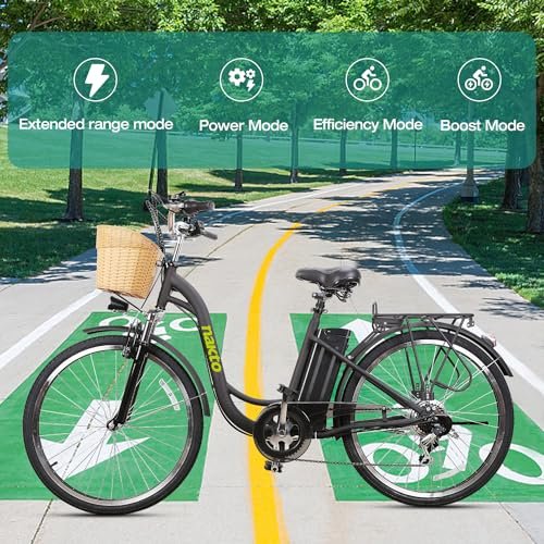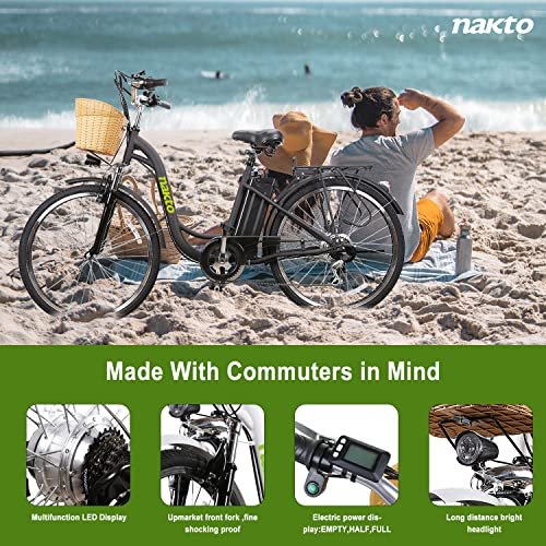 • NAKTO Electric Bike for Adults Peak 500W Electric Bicycle with Basket Up to 24MPH 48 Miles City Commuter Ebike UL Certified High Brushless Motor, Speed Gear, Front Fork Suspension
