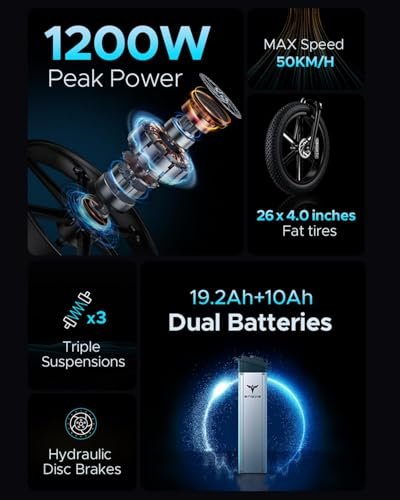 • ENGWE X26 Fat Tire Electric Bike, 1200W(Peak) Motor Ebike for Adults,95 Miles 31MPH 26” Mountain Ebike,48V19.2A(29.2Ah-Dual Battery Option),All Terrain