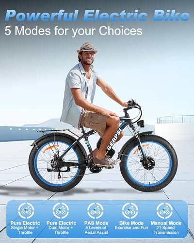 This electric bike is equipped with 2000W high-speed brushless hub dual motor,provides strong power for ebike.The dual motor e bike accelerates faster,the speed can up to 35 mph.And the ebike makes climbing faster and easier,it can easy to climb 35 slope.E-bike is equipped with 21-speed gears,help ride easily to against the snows,beaches,gravel trails,dirt paths,hills and bumpy roads.bringing a brand-new riding experience for outdoor enthusiasts Large capacity 48V 20AH removable battery provides long-lasting power,it can ride up to 82-100 miles in the PAS mode and 42-50 miles in the pure electric mode.The large capacity lihium battery can be fully charged in about 5-6 hours with a 3A charger.Long battery life makes you to ride farther. Riding this electric bicycle and enjoy your relaxing time instantly & The electric bike for adults with lockable suspension front fork can absorb most of the bumps and vibrations during the ride,which effortlessly navigates bumps,rocks,and uneven terrain,ensuring remarkably smooth ride.Front and rear hydraulic disc brakes can easily brake within 2 seconds,Significantly reducing braking distance and adding extra security to your riding experience -& This electric mountain bike is equipped with 26 x 4 fat tires,increasing riding stability.The good stability is suitable for all terrains and all weather,such as mountains,highways,beaches,snowfields,city roads and gravel roads.Adjustable seats allow riders to adjust their height to suit themselves, making riding more comfortable & Smart waterproof LCD can easily to read to data during the day and at night,such as speed,trip distance, battery life,gears,etc.The full brightness low power consumption headlights provide strong and full illumination both day and night,with the horn on the e bike,making riding safer at night.This electric bicycle has pure electric mode, PAS mode, and pure bicycle mode,you can choose different modes according to your own usage & 85% of e-bike is already assembled.You just need to install the seat,handlebar and other parts on the frame.All e bikes come with a one-year guarantee quality service.And we have a responsible after-sales service team.If you encounter any problems,please contact us.We will reply promptly and provide technical support.Don t research on your own,contact us,and help you solve the problem.Please keep the original packaging box for one month to avoid potential returns [] . – .