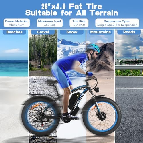 2000W Dual Motor Ebike : The DP-2602 electric bike is powered by two 48V/1000W high-speed brushless motors that deliver strong power. With a maximum torque of 75N.m*2, its cruising speed can reach up to 35 miles per hour. The dual motor design not only provides powerful propulsion, easily climbing various terrains, but also ensures exceptional traction and stability on wet or rough surfaces. Experience an unprecedented joy of riding! 48V 23Ah Removable Battery : This electric bicycle comes with a 48V 20AH removable battery that can be fully charged in 5-6 hours, can ride up to 80-100 miles in PAS mode,and 40-50 miles in pure electric mode. The specific range varies based on road conditions and the rider s weight. It s perfect for daily commutes or weekend explorations, providing you with a dependable journey and ensuring you arrive at your destination energized. Smart LCD Color Display : The electric bike is fitted with a high-definition LCD color display, enhancing your riding experience with a touch of technology and convenience. The display is not only stylish but also rich in features. It can show real-time battery level, speed, gear, and mileage. The clear and visible ride data on the display allows you to effortlessly manage your riding status, ensuring a safe and efficient ride. Ebike 26*4 Fat Tires : The DP-2602 electric bike is equipped with 26*4 inch Fat tires, enabling you to enjoy riding on various terrains such as roads, snow, mountains, beaches, and gravel paths. The high-performance 21-speed gear system facilitates easy climbing, descending, slow riding, steady, and acceleration. Moreover, it s equipped with a powerful headlight to ensure your safety while riding at night. High-Quality Components : The frame of the BAOLUJIE electric bike is made of high-strength aluminum alloy, durable and long-lasting. Paired with a lockable shock-absorbing front fork, it seamlessly absorbs irregularities of the terrain, providing a smooth ride in various environments and helping to reduce fatigue during your journey. The bike also comes with a rear rack, fenders, and an adjustable seat. Worry-Free Warranty : The bike is 85% assembled. BAOLUJIE offers a comprehensive warranty service for the electric bicycle: a 12-month warranty for the motor; a 1-month warranty for auxiliary systems, switches, throttles, and front lights; and a 12-month warranty for the front fork, display, controller, and charger. The power transmission, pedals, and stand come with a 1-month warranty, and the battery has a 6-month warranty.