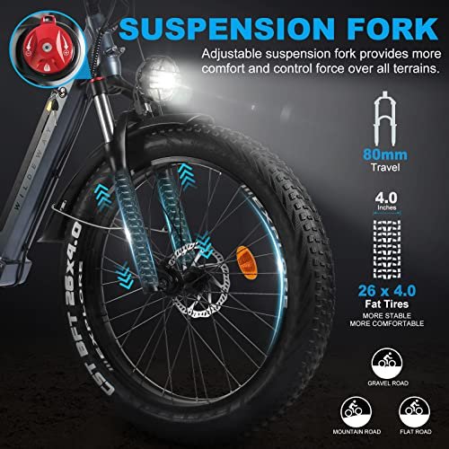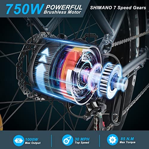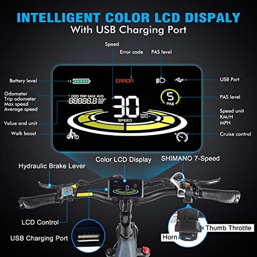 Excellent Features Equipped with a powerful 750W brushless motor, this adult electric bike achieves a maximum speed of 30mph and a torque of 85N.m, which is enough for daily commuting and short trips. With 48V 17.5Ah Battery, this ebike can last up to 40-55 miles on a single charge. The removable design allows you to charge the battery anywhere Easy Control Easy Read With a full-color LCD display, thumb throttle, LCD control, Shimano 7-speed shifting system, new riders can also easily get up and running. Full-color LCD screens have higher resolution and better sunlight readability. And there is a USB charging port on the left side of the display to charge your device Comfortable Riding Experience Features an adjustable front suspension fork with 80mm of travel to keep you in control and comfortable on rough terrain. Wide 26*4.0 fat tires and wide saddle enhance riding stability. Adjustable bicycle handlebar stem adjust the handlebar height according to your needs to ease the discomfort of long hours of riding Safety and Security Front and rear hydraulic disc brakes offer the cyclist more powerful and consistent method of braking across all weather conditions. Get better modulation, increased stopping power, and more safety. Come with super bright LED headlight, brake rear light, and warning spoke reflectors providing you with a comfortable and more safety riding journey wherever you go Expandable Accessory There are mounting holes for front and rear baskets and bottle cage holder on the frame, and you can attach the right basket and bottle cage holder according to your needs. Easily upgrade your bike to carry more items to meet your transportation needs and make outdoor activities more convenient