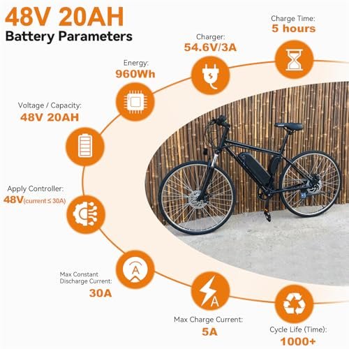 — Clear parameters! 48V 20Ah Battery is equipped with a 30A BMS,Max constant discharge current: 30A.Suitable for 48v controller and 1000w/750w/500w(100w-1000w)motor. Battery Size: L 14.46*W 3.7*H 5.4 inches.Weight: about 11.82 LBS. Charger: 54.6V 3A Fast Charger,save more time for your riding. The Ebike battery charge cycle exceeds 1000 times,Discharge:Female XT60 Discharge Cable. — Why choose 48V 20AH ebike batteries Safe Lock:Anti-theft function. LED power Indicator:Real-time battery level detection,reminds you to charge the battery. Power Switch:Reduces battery power loss. USB Port:can charge your phone. 30A BMS:can effectively protect the battery and make it safer. Waterproof case:Reduces the possibility of damaging the internal battery. Anti vibration Pads:It has already adhered to the battery base.Protect the battery and reduce battery damage. 5Pin Discharge socket:Product with battery base, easy to install. Discharge wire with yellow wax tube, which is waterproof, anti-electricity and high temperature resistant! — How to determine if the 48V 20AH Lithium ion battery is suitable Voltage of your controller: 48V. Rated current of controller: 30A. Motor wattage: 250W-1000W. Whether the battery size(L 14.46*W 3.7*H 5.4 inches) is suitable for your battery pace.Upgrade and transform your electric bicycle/tricycle/scooter.etc. In order to reduce battery vibration, the battery and battery base are tightly fitted. If you don t have the strength to open it, you can use tools. — What does the package contain 1 x 48V 20Ah Battery,1 x 3A Fast Charger,1 x 5Pin Battery Holder,1 x Male XT-60,2 x Keys,2 x Anti Vibration Pads,1 x User Manual.We are committed to providing high-quality products and good shopping experience!30A BMS-Battery Management System,which can effectively protect the battery and make it safer.A grade cells,You can ride safely with LGECOLFP battery. — Is there after-sales guarantee for the battery 3*Months Free Return / Replacements/ 12*Month Warranty,Package is damaged due to logistics/Package has not arrived/Battery does not work/Battery questions.etc.Please contact us at the first time, we will be responsible for the product and help you faster!Good communication can better solve problems. Please make sure to contact us so that we can help you solve the problem. –How to contact us from your order: Click Account&Lists Orders Get help with order Enter information Send e-mail. Why choose our lithium battery US Warehouse We have US CA warehouse, the battery set usually reaches you in 2-5 days after order. After-sales Guarantee If you have any product question, please contact our support team via email. We will solve your problem within 24 hrs. Warm reminder Before purchase, please kindly check if battery specification( Voltage, Capacity, Power, Size) fit. Many battery styles The store has 36V series batteries, 48V series batteries, 52V series batteries. If you want the detailed parameters of the battery package, please contact us! If you have any questions about the product, please contact us! 30 days free returns and 1 year warranty in our shop!