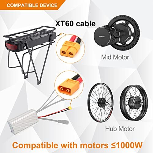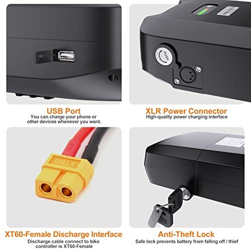 PRODUCT PARAMETER:The 48V 17.5Ah Rear Rack Battery is compatible with 500W 750W 1000W electirc bike motor . The max constant discharge current is 30A . Charger : 54.6V 2A , Discharge : XT60 Female Port . Please confirm that there is screw holes on your rear for for installation BMS PROTECTION:The 48V 17.5Ah Rear Battery is with 30A BMS protection board , which is safe to use . The electric bike battery is designed with over charge , over discharge , over current , short circuit , high temperature , over voltage protection . High quality battery makes your cycling trip without worry DESIGN FEATURE:Featured with a rear rack , you can have more space on the downtube and keep your water bottle . The rear battery is easy to be mounted and remove , and you can charge the battery anywhere and anytime. With a battery lock , you don t need to worry about battery being stolen . A USB port helps you charge your phone outdoors easily . On / Off switch button and indicator light make battery using safer and save more power HIGH END QUALITY:Every lithium battery has passed QC appearance and function test before shipment . The ebike battery charge cycles exceeds 1000 times GLOBAL STOCK & CUSTOMER SERVICE:Delivery will be on time and faster than the ETA on Amazon. If there is any problem with inventory, we will message you, please keep an eye of your Amazon inbox. We have professional techs in USA providing you with technical support . Responsible & patient customer service, no worry about after-sales at all. How to get touch us on Amazon: Help & Settings Customer Service