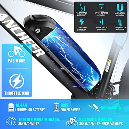 LARGER CAPACITY BATTERY: Up to 25-55 miles per charge with the powerful 48V-10.4Ah battery. Plenty for a day s adventure or most trips to work and back. You can charge on/off the ebike by your convenience. No worry for being stolen. UPGRADED TRANSMISSION SYSTEM: Professional 24-Speed gears increases stronger hill-climbing power, further range variation, and greater terrain adaptability than 21 speed gears. Front and rear mechanical disc brakes provide powerful, progressive braking even in rainy conditions. 48V 350W MOTOR: Compared with 36V, 48V has faster acceleration and provides more powerful power when climbing, 350W regular output power/550W peak output power. 48V motor provids more than enough to power your daily commute, a cruise on the mountain, or a meander along your favorite trail. With speeds up to 20 mph,it will get you there swiftly. UPGRADED LCD DISPLAY: 5 Speed Display, Motor Power Ratio Display, Battery Level Display, Mileage, Light Signal. You can have more choice for 5 speed mode than normal 3. The large LCD display guarantees you can read your statistics easily. EASY TO FINISH ASSEMBLY Our electric bike is 85% pre-assembled and you only need to finish the assembly of main parts. we also have the assembly video for you on the product page. With one-year service for the electric motor, battery and other main replaceable parts, you ve no worry about using it. There is an electronic user manual at the bottom of this page, you can preview it in advance, and ANCHEER Blue Spark provides lifetime technical support.