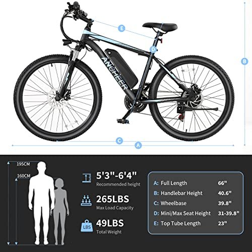 POWERFUL ELECTRIC SYSTEM With removable 48V-7.8Ah(374.4)Wh battery, you can pedal assist to 40 miles per charge using the low pedal assist level. 500w brushless geared motor provides reliable support and 20MPH top speed. providing more than enough to power your daily commute, a cruise on the mountain, or a meander along your favorite trail. You can easily handle most of the hillsides encountered. MOUNTAIN BIKE CONFIGURATION The fork is made of high strength carbon steel and the frame is made from aluminum alloy. This makes the bike lightweight yet very sturdy. With the 21-speed transmission system, you can choose any speed according to your needs. The perfect front and rear disc brakes fully protect your safety. Aluminum Alloy double-walled rims are for greater durability. UPGRADED LCD-DISPLAY CONTROL SYSTEM ANCHEER SUNSHINE has upgraded the LED quick-display instrument to an LCD large-screen smart instrument. You can set 1-5 gears at will to cooperate with the pedal assist system, and switch the handlebar mode to get a clearer real-time speed and mileage. TURN THROTTLE OR PEDAL ASSIST We provide four levels for power assistance. You can choose to turn the thumb throttle or step on the pedal to activate the motor. You can switch between pedal assist and thumb throttle at any time. The four-levels power output is sufficient to meet your daily commuting needs and outdoor climbing needs. You can add a burst of speed with the throttle, which is ideal for pulling away from traffic lights. EASY TO FINISH ASSEMBLY Our bike is 85% pre-assembled and you only need to finish the assembly of main parts. we also have the assembly video for you at the seven window picture on the product page. With one-year service for the electric motor, battery and other main replaceable parts, you ve no worry about using it. The assembly service on this page is provided and charged by third-party company. If you can t finish by yourself, you can click and choose the service. SAFETY FIRST: Our commitment to safety has been recognized by SGS through certifications UL 2849 (for the whole ANHEER electric bike) ANCHEER 26 inches ebike