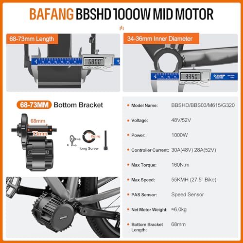 WIDE COMPATIBILITY:The BAFANG 1000W BBSHD mid drive kit is compatible with bottom bracket measuring 68-73mm in length and 34-36mm in internal diameter. You can easily install this mid mount motor on your mountain bike , road bike and commuter bike . However, it is not recommended for bikes with a carbon fiber frame or coaster brakes. The powerful 8fun motor will elevate your cycling experience and make your trips more exciting POWERFUL MOTOR & CYCLING MODES:The BAFANG 1000W G320 electric bike conversion kit boasts a maximum torque of 160 N.m , allowing you to reach speeds up to 55KMH (for 27.5 bike) and exceptional climbing performance. Experience the thrill of riding at maximum speed with minimal effort, making it perfect for both exercise and pure enjoyment. The mid-drive motor offers three cycling modes: Electric Bike (Thumb Throttle Mode), Pedal Assist, and Normal Bike , various modes for different needs EASY INSTALLATION:Converting your bike to an electric bike has never been easier! We provide installation instructions and videos to guide you through the process. Don t hesitate to reach out to us for assistance. Our BBSHD motor, equipped with an integrated controller, offers outstanding performance with minimal noise. Its high efficiency and low consumption make it an irresistible choice for any rider. Get ready to experience the convenience and power of electric biking! PACKING LIST:In this order, you will receive the following items: the M615 1000W mid drive motor , a display , a chainring , a speed sensor , brake levers , cranks , a 1T4 EB-BUS cable , a thumb throttle , and lock nuts . As a bonus, we include headlight , wrench ,and crank removal tool . Please note that if you wish to keep your original hydraulic brakes , kindly reach out to us for further assistance. Enjoy your electric bike conversion FAST & PROFESSIONAL & KIND:In the rare event of inventory issues, we ll notify you promptly, so please keep an eye on your Amazon inbox. Our North American after-sales service ensures outstanding technical support and maintenance. Shop with confidence IMPORTANT NOTE:If you order a motor without a battery , we will default to sending you a 52V motor . If you prefer a 48V motor , please inform with order ID. Please note that the controller for the 48V motor is 30A, while the controller for the 52V motor is 28A. If you have any questions or specific requests, just reach out to us. We re here to help