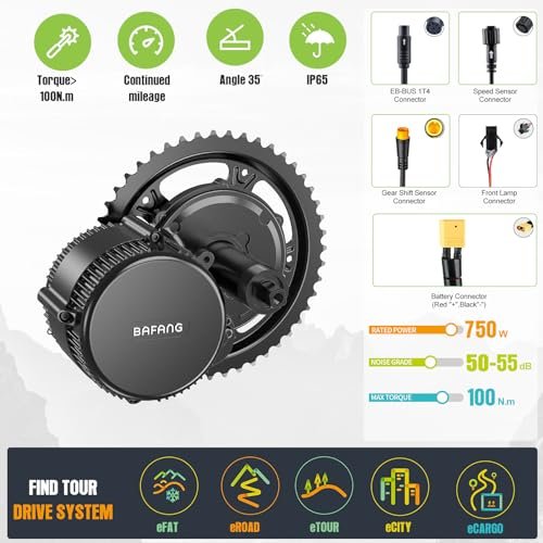 Universal Compatible:The motor kit default send fit 100MM bottom bracket, pleaes double check your size of bottom bracket. Bafang BBS02B 750W Mid drive motor kit is compatiable with fatbike,mountain bike,snow bike and so on Easy Installation & Three Riding Model:Easily convert your pedal bike into a motorized ebike by refering the video in Youtube. Three riding Model (E-bike & Pedal Assisted bicycle&Push Assisted Bicycle) for you to choose, you can choose the E-bike to enjoy a long time travel, and also exercise Complete Accessories:Comes with all necessary accessories:Mid-drive motor BBS02B 48V 750W,brake lever or brake sensor,thumb throttle,chainring wheel,crank,LCD display, battery and charger (optional),speed sensor and magnets,1T4 wire,locknut,and more accesary (ebike tool ,headlight, stickes, power extension cable, long bolt and gasket for BB100mm) Powerful and Reliable Motor:LThe BBS02 750W100mm motor max torque up to 100-120 N.m. This mid speed sensor motor will easily climbing, go well over 25mph on the flats and much, much faster down hills. Privode more powerful when you riding on the road or climb the mountains Satisfactory service:Replacement or maintenance if any quality problem within 1 year. Local service center, providing technical support and maintenance