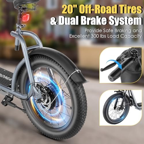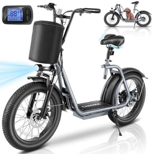 Fast & Long Range Caroma P3 electric scooter with seat is powered by a robust peak 819W motor, reaching top speed of 20 mph and handling 20 degree hill grades with ease. Its high-capacity 48V 10.4AH lithium battery, enhanced by regenerative braking, provides a remarkable range of up to 30 miles. The sooter electric has 3-speed modes: Eco Mode (10 MPH), Drive Mode (15.5 MPH) and Sport Mode (20 MPH). Perfect for commuting or leisure rides. Comfortable Riding This adult electric scooter features a soft breathable seat, so you won t suffer from fatigue on a long-distance ride. The thick and sturdy 20 Pneumatic tires absorb most shock, offering a comfortable riding experience. The 9 x 17 wide deck provides enough room for your feet or even a cute pet. LCD Display & Safe to Ride The LCD monitor of the e scooter shows the battery level, current speed, speed mode, single and total mileage, so you can get a clear picture of your riding. The effective front and rear disc brake on the e-scooters provide excellent stability and control. The high-brightness headlight and rear brake light keep your riding safe at night. Foldable & Sturdy Frame Equipped with foldable handlebar, the electric scooter with basket can be easily stored and carried in your trunk, you can ride it anytime you like. The detachable basket is prefect for shopping trips around the block. The triangular high-carbon steel frame provides more stability, supporting a maximum weight of 300 pounds. Easy Assembly & After Sales Service The electric scooters are UL 2272 certified. The installation steps are very simple, which are explained in detail in the instruction manual. We provide a 12-month warranty for the commuter scooter. If you encounter any problems with it, don t hesitate to contact us and we will provide you with satisfactory service.
