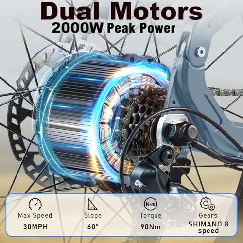 2000W Dual MOTORS The adult electric bicycle is equipped with dual motors total peak output of 2000W(1000W motor for each front and rear drive),which provides massive amounts of 180Nm torque when powering up steep hills or accelerating quickly from a dead stop. With 2000W of peak motor power, you can easily conquer the most rugged terrains,dominate any ebike mountain bike trail.It is the best choice for off-road, mountain, outdoor, long-distance travel.Get your RX30 and keep wild on DAMSON! Large Capacity Lithium Battery RX30 Adult bicycle provides 48v 30ah Removable Lithium Battery,1440wh battery capacity efficiently improves the range,stability, and safety of bikes. A single charge can last up to 35-90miles(dual motor) ,68-120miles (single motor).The long-range option ensures you can get where you need to go without having to worry about running out of juice. It has 2 charging modes,hidden built-in waterproof battery and removable charge,more convenient. Full Suspension Ebike 2000W Electric bike for adults boast an adjustable front fork alloy hydraulic lockout suspension fork and rear suspension,which ensures comfortable rides whether you re landing from stairs,crossing rocky roads or climbing up gravel slopes.The puncture-resistant, durable 26 4 fat tires crushes over obstacles and shocks,conquer all kinds of rough terrain,making a stable ride for your adventure,helping to indulge in the ultimate off-road thrill of the mountains and forests! Superior Braking Performance The 160mm dual hydraulic disc brakes provide ample stopping power even in the harshest conditions, while super-sensitive brakes make even steep slopes a piece of cake. Reliable braking is essential whether you re in the city or countryside because it helps you stop on a dime. Equipped with an Ultra Bright LED headlight and integrated taillight indicator, this bike keeps you visible to all, greatly improving your riding safety, stability, and handling. 5 Riding Modes E-bike & assisted bicycle & normal bike & Cruise Control& Walk Booster 5 riding modes swith easily for enjoying a long time travel,and also exercise.Shimano 7-speed,you can choose any speed according to your needs, enjoy a safe and smooth journey. The intelligent LCD display precisely keeps track of real-time speed,battery level,pedal assist level,mileage and other stats. Perfect your exercising and commuting.Equip with USB charging port,it can charge your dying cell phone. Reliable Service &WARRANTY Shop Now & Get FREE Premium Phone Mount, Rear view mirror ,fenders,lock & Pump.Adult electric bike already comes 95% pre-assembled so you won t have to waste time with complicated assembly.we provide lifelong technical support.With 1-year warranty for the electric motor,battery and the charger.if you are not happy we are not happy until everything is fixed.DAMSON team will give you the most satisfactory answer within 12hours to ensure your riding journey like a dream!