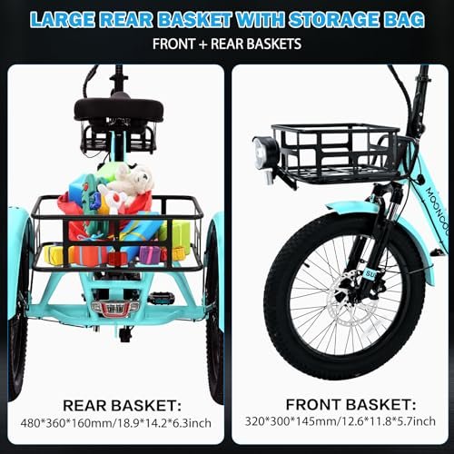 500W ELECTRIC MOTOR The electric trike is equipped with a 48V 500W helical motor with a peak power of 750W and a peak torque of 43NM. Provide you with an upgraded cycling experience. This not only improves speed and torque, but also eliminates any concerns of startup slippage, providing excellent traction on slippery roads. REMOVABLE BATTERY Equipped with a 48V 14.5Ah removable battery, offering a range of 35-45 miles per full charge. Enjoy prolonged rides and the convenience to charge while on the move. FOLDABLE DESIGN Thanks to its foldable design, it is an ideal choice for commuting and space-saving. Take advantage of the spacious front and rear baskets, offering ample storage for your travels. ALUMINIUM FRAME Our folding electric tricycle features aluminium alloy frame, hydroformed down tube. Meticulously designed for enduring strength and durability. Upgrade 3 Tail lights, brake highlight function, and turn signals function to ensure your riding safety. SUPPORT SERVICE – Provides all customers with a one-year warranty for the purchase of our adult tricycle. Feel free to contact us through Amazon message, We will solve the problem for you in time.