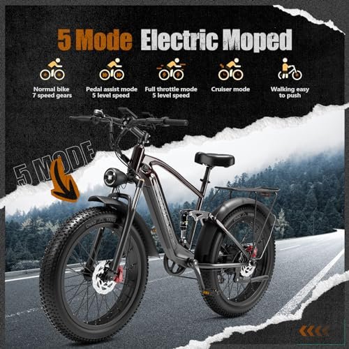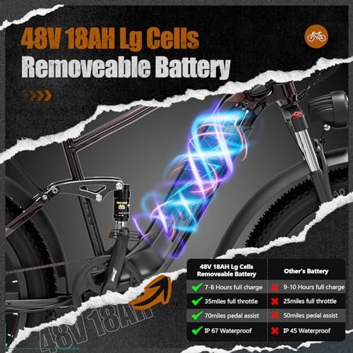 [ Electric Bike LG Cells Battery] battery power bike is equipped with a 18Ah 48V LG Cells lithium-ion battery, which provides the bike with 35+ miles of throttle mileage. And the battery is lockable and removable and easy to carry to charge whether at home or work. [Pedal Assist EBike] This SWIFT PRO electric bicycle was designed with pedal assist mode for riders, it has 5 level speeds adjustable, the fastest speed can go up to 32 mph, and the battery will provide you 70+ mile travel range. (The mileage and top speed will vary based on terrain, weather, load capacity, and so on) [750W Mountain E bike] This mountain ebike equipment with a 750W high-speed brushless hub motor, torque up to 82NM, which provides plenty of power to tackle steep hills up to 30 , which helps mountain ride easily to against the hills, gravel trails, dirt paths, and bumpy roads. [5 Mode Electric Moped] 1, ride it as a normal bike if the battery runs out, the 7-speed gears help riding more easier; 2, pedal assist mode, the battery gives plenty of power to assist to ride when you are pedaling; 3, full throttle mode, press the thumb throttle, the bike will auto move without pedaling; 4, cruiser mode, set a constant speed to cruising without pressing the throttle; 5, battery assist in pushing the bike, so that you can easy to walk away with the bike [Full Suspension Ebike] Experience a smooth and comfortable ride with the Full Suspension Ebike s lockable and adjustable front suspension fork, combined with a reliable rear shock absorber. Whether you re navigating rough hills, bomby terrain, or city streets, this bike s powerful suspension system is designed to ease bumps and provide maximum comfort, allowing you to ride for longer periods without feeling fatigued. [Electric Bikes with Hydraulic Disk Brakes] The dual hydraulic disc brakes system ensures the e bike with quick and smooth stops even when riding at high speeds, shortening the braking distance, even on wet roads, keeping you cycling more safely. [Ebikes for Adults] This electric touring bike was designed with anti-slip 26 * 4.0 big tires, the max load capacity can reach up to 330lbs, which is fit for big and tall riders, the recommended height is 5 7 to 6 5 . [Fat Tire Electric Bike] This mountain bike with 4 x 26 fat tires, can handle almost any terrain, the fat tires really grab the road and provide ebike riding with stability at high speeds and during maneuvering, would add comfort and ability to ride off the paved paths, it s easily going over rocks, perfect for the different surfaces such as potholes/uneven sidewalks, dirt road, sandy, snowy and rocky roads. [EBIKE WARRANTY] provides 12-month warranty for our e-bikes frame, motor, battery, controller, and LCD display, most of the other parts are under 6-month warranty, please read our warranty description carefully when you receive the package. If you have any problem, please feel free to contact us. We will respond within 24 hours, and we will take responsibility for each of our ebike.