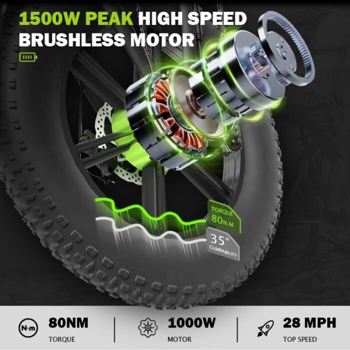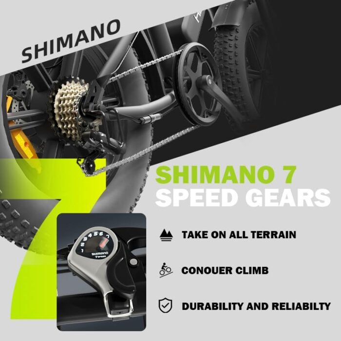 1000W Brushless Hub Motor The 1000W peak brushless hub motor offers enhanced climbing ability, reaching speeds of up to 32 mph in pure electric mode, effortlessly conquering gradients of up to 35 degrees.Additionally, it features brighter LED headlights and taillights to keep you visible and safe during nighttime rides. 70 Miles Long Range It can travel up to 31 miles per charge in electric-only mode and up to 70 miles in pedal-assist (PAS) mode (The load and road conditions can affect the range). The durable 15Ah upgraded detachable battery (with key lock) and IP54 waterproof rating can be conveniently charged in just 6-8 hours. Shimano 7 Gears&Dis Brakes System Ride with confidence, day or night, the bright headlight, rear turn signal and brake light alert others to your presence.With the gears 7-speed and dual disc brakes, you can effortlessly shift gears and confidently stop, giving you full control over your riding experience. High Percision Engineering Design This electric bicycle frame is made of high-carbon steel, easy to climb 35 degrees Tire: 20 * 4.0 snow tyrep; Enhanced anti-skidding and wear-resistant tires. Adapt to all terrain, snow road, sand road, gravel road. Front and rear mechanical disc brakes bring you peace of mind. Easy Riding with LCD Display The large M5 LCD display shows electric bike s speed, battery level, odometer and more. You can easily see the status of mountain electric bicycle, making your riding more convenient and easy. Easy Assembly The bike comes 90% pre-assembled. You only need to install the front wheel and handlebars to hit the road, making your first experience effortless and worry-free. Available Services 1-Year Warranty Against Manufacturer Defects. If you have any questions, please feel free to let us know and we will respond within 24 hours. Please keep the original box in case return.