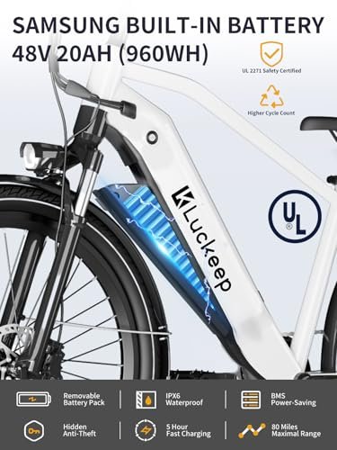POWERFUL HIGH-SPEED BRUSHLESS MOTOR WITH 1300W PEAK : The Luckeep adult electric bike is equipped with a powerful brushless 750W motor with Max speed up to 28MPH, providing powerful clim capacity to conquer hills and tackle challenging terrains with ease. Perfect choice for daily commutes and outdoor adventures. 48V 20AH (960WH) REMOVABLE CELLS BATTERY : With UL 2271 certified built-in battery, travel can up to 80 miles in pedal assist mode. Cells battery is specially designed for higher cycle count and a longer lifespan than ordinary battery, providing extended usage time for your bike. Optional 15AH/20AH/25AH external batteries extend your Traveling to Max 180Miles UPGRADE YOUR RIDE WITH THE TORQUE SENSOR : The E Bike Torque Sensor is transmission technology that recognizes your pedaling cadence, meets you where you re at, and amplifies your output, conserving battery life and extending riding range. You can easily control the speed of the ebikes with the foot pedal speed control, that is, step on the bike, and stop when the foot stops, no need to disconnect the brakes, safer. ENSURE MORE COMFORTABLE RIDE : Customize suitable speed with the 8-speed gear shift (13-32T) to tackle any terrain with ease. Non-slip and wear-resistant 27.5 X 2.4 tires is perfect for any road condition, including sand, snow, and mountain paths. Our electric bikes features a 6061 one-piece aluminum alloy frame with hydraulic brakes and hydraulic front suspension for stronger braking and less inertia to withstand greater weight and impact, ensuring a worry-free ride. SMART APP CONTRAOL & ANTI-THEFT ALARM : Manage your e-bike ride via the app to customize preferences, monitor ride status, and share bicycles cycling history with friends. The anti-theft keyfob enables ebike unlocking and includes an alarm system to deter theft. EMBEDED IPS DISPLAY & FIVE OPERATING MODES : advanced 3.5 IPS display embedded design to Avoid External Damage. This Ebike offers five customized riding modes: traditional riding(8 Speed), pure electric cruising and boosting walking, sport pedal assist, meet your different needs in different use scenarios. The five riding modes can be easily switched to enjoy long-distance travel and exercise at the same time.
