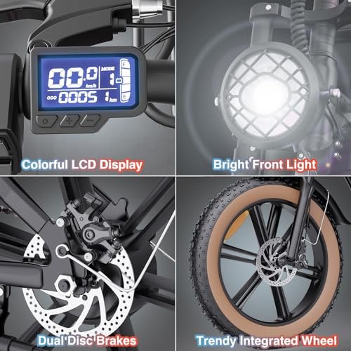Unique Style & Sports Vision: The adult electric bike features a unique and creative design, including a stylish headlight for enhanced safety during nighttime rides. The saddle is delicately soft, supported by a reinforced pole and hollowed-out bracket, providing an exciting sports adventure experience. Get ready to make heads turn and be the envy of others with this trendy adult electric bike, embracing the latest fashion trend PEAK 1500 W Motor & 20 x4.0 Fat Tires: The e bikes is equipped with a powerful peak1500 W brushless motor, delivering a maximum speed of 30 mph and a torque of up to 85 nm. It effortlessly conquers steep slopes with angles of up to 35 . With its 20 x4.0 fat tires, this electric motorcycle is suitable for all terrains, including snow, beach, mountain, and city roads. The professional Shamano 7-speed system ensures precise and responsive gear shifting 3 Riding Modes & Long Distance: The electric dirt bike for adults offers three riding modes: pure electric, electric assist, and pedal. It features a removable 48V 15.6 AH lithium-ion battery, providing a range of up to 25 miles in pure electric mode and up to 50 miles in pedal assist mode. The UL 2849 certified battery incorporates BMS security protection and power-saving capabilities. With a fast charging time of 4-6 hours at 3A, you can quickly get back on the road Full Suspension & Hydraulic Dual Brakes: Our Adult Dirt Electric Bike boasts a 5-stage full suspension system with dual fork spring dampers, a seat spring damper, and two 20 X4 puncture-proof fat tires. Experience a smooth ride while conquering any terrain. The dual disc brake system ensures shorter braking distances, providing safer and more dependable riding, even in harsh weather conditions Easy & Safe Riding: The adult electric dirt bike features an advanced LCD display that provides real-time metrics, adjustable parameters, and various trip-tracking options. With bright LED headlights and IP5 waterproof protection, you can enjoy safe riding in diverse road conditions. The bike has a maximum load capacity of 330 lbs Features & Accessories: The electric bike comes with a convenient 7.2 phone holder and a spacious storage box. It features a USB charging port for phone charging on the go. With 90% pre-assembly, installation is quick and easy