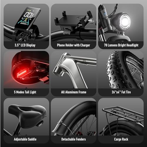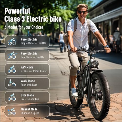 Peak 3000W Dual Motor With 2000W dual motors (Peak 3000W), the powerful ebikes have added pickup, torque, and top-end speed. Increased power lets you tackle all terrain and climb 40 uphill easily. Double output results in a fast 37 mph speed and a quicker take-off. Upgraded 52V 23AH 1196WH Lithium Battery The electric bikes for adults are equipped large capacity 1196WH removable battery, which offers more range per charge and more cycles (1000+). With a single mode, the peak 3000W ebike can ride up to 90 miles in PAS mode, and 50 miles in pure electric mode. With dual motors, you can enjoy a long travel range of 30-50 miles. Dual Hydraulic Disc Brakes The upgraded hydraulic disc brakes system offers the strongest stopping power, longer lifespan, all-weather suitability, and less maintenance. With the responsive brakes, you can enjoy the speed and fun of a class 3 ebike with confidence. Full Suspension System The full suspension ebike features a lockout front fork and a rear shock and saddle with springs. It helps absorb vibrations and shocks from uneven ground, making you more comfortable in the saddle. In the meanwhile, it increases traction, which gives you greater control and helps you enjoy a safer rider. 6 Modes Ebike The electric bike has 6 riding modes: Dual Motor Pure Electric / Single Motor Pure Electric / Pedal Assist / Walk Mode / Cruise Mode / Bike Mode. 5 Assistance Levels are provided, 10/16/22/28/37 mph separately. The fastest speed can reach up to 37 mph, depending on the battery power, load weight, and road condition. All Terrain Suitable Fat Tire Fat tires offer good traction, stability, and shock absorption. Equipped with 26 x 4 fat tires, the bikes are suitable for almost any road and all weather. With bigger tires and added padding, the fat tire electric bikes give you a more comfortable ride. High Configuration 3.5 Smart LCD gives you all useful information current speed, assist level, mode, odometer, etc. 7-speed gear kit, and lockout front fork give you more choices on different ride conditions. Dual hydraulic brake system and full suspension system assure your safety and comfort. All aluminum frame provides enough strength and low weight. 90% Assembly The bike comes with 90% assembly and all necessary installation tools. Please watch the installation and operation videos on the goods page. Any problem during the process of assembly and use, we are always here to porvide support for you. 37MPH Electric bike for adults with dual peak 3000W brushless motors, 48V 23AH 1104WH Lithium battery, full suspension, dual hydraulic disc brakes, 3.5 smart M5 LCD, 6 modes