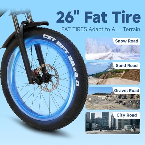 EXTRA ACCESSORIES : You will get some extra accessories, rearview mirror, helmet, mobile phone holder, ebike lock, charger, instruction manual that comes with the bike. and velCying electric bicycle is 90% pre-assembled, you only need to complete the assembly of the main components 1000W HIGH-SPEED BRUSHLESS MOTOR velCying adult electric bicycle is equipped with a powerful 1000W high-speed brushless motor, and the huge torque of 90N M allows you to easily conquer various rugged terrains. Mountain electric bicycles are the best choice for off-road, mountain, outdoor and long-distance travel. LARGE CAPACITY 52V23AH BATTERY The ES9 electric bicycle has a built-in large capacity 52V 23Ah removable lithium-ion battery with a cruising range of 37-75miles (Note: the mileage range depends on whether it is under pedal assistance and pure electric mode) It takes about 6-8 hours to fully charge 26 X 4-INCH FAT TIRES The mountain electric bike is equipped with 26x 4-inch fat tires, which can travel through various terrains, including mountains, snow, beaches, cities, and jungles. Dual shock absorbers front and rear reduce bumps on rough roads. Dual hydraulic disc brakes provide excellent stability and safety. 7 SPEED GEARS & HYDRAULIC BRAKES The ebikes for adults adopt front and rear hydraulic disc brakes, which provides more effective braking in rainy weather, heavy off-road, long downhill and adverse conditions compared to traditional mechanical brakes. The unique bike frame is made of high quality 6061 aluminum, more lightweight and durable. Equipped with professional 7 speed gears, delivers reliable and accurate gear shifting, you can adjust the speeds smoothly 5 RIDING MODES ES9 electric bike for adult provides 6 riding modes (Motor Pure Electric, Pedal Assist, Walk Mode, Cruise Mode, Bike Mode) You can use rear motor only or both front and rear motors. Max speeds up to 32mph, depending on battery power, load weight, and road conditions. Adult electric bicycle 1000W, large capacity 52V 23Ah removable lithium battery, 32MPH, 60-120KM long cruising range, 26-inch fat tire off-road snow beach mountain electric bicycle, dual suspension