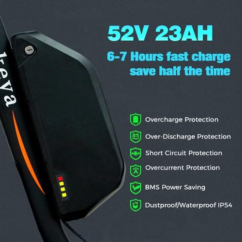 & 35 Dakeya fat tire electric bike equipped with 1000W Front(Can be closed by handle button) & 1000W Rear brushless motor. Dual motor electric bike provide max 75*2NM torque and max 35MPH, and easy to clim 45 slopes. Very suitable for off-road challenges in complex terrain such as various mountains/steep slope.Take you to challenge more exciting projects. 52 23 & 2 Our electric bike for adults with 52V 23Ah large capacity removable battery, which distance up to: 40-60miles(Single Motor), 30-50miles(Dual Motor). It only takes 7-8 hours to charge the ebike with a 2Ah standard charger, whether charging directly on the electric bike or taking the battery out to charge. & 2000W electric bikes is designed with lockable front fork suspension and dual hydraulic disc brakes, which can effectively reduce the bumps when going down stairs or passing through speed bumps/gravel potholes/slopes, hydraulic disc brakes provide quick braking for safer riding. & 3-speed sprocket/7-speed transmission system, which support you to easily achieve uphill, downhill, slow speed, constant speed and acceleration. 26 x 4.0 fat tire electric bike effectively increases riding stability. You can enjoy your ride in all terrain such as highways, snowfields, mountains, beaches and gravel roads. 3 & Electric bike for adults support pedal mode/fully electric mode/pedal assist mode(PAS). 2000W adult electric bicycles provides 1-5 level pedal assist(+rotate the throttle) to meet your daily commuting and outdoor needs. Rotating throttle also is an ideal choice to accelerate when red-green lights. Ebike frame is made of high-quality aluminum, with a maximum load capacity of 350LBS. & electric bike for adults adopt large LCD Display can display battery/gear/speed/mileage in real time, making your riding more intuitive. Phone holder with a USB charger port that won t let the dead battery delay or interrupt your riding plans. 8% & Please keep the original packaging box for 30 days Your adventure begins easily as the e-bike comes 80% pre-assembled. Find assembly videos and updated manuals on the product page to ensure easy setup. Enjoy peace of mind before your first ride with an 12-month warranty on e-bike components. If you have any questions about your DOF electric bike, our customer service team is here to help.