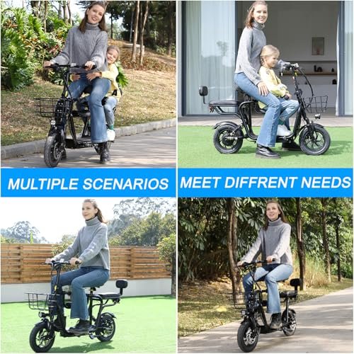 Special design : Electric Scooter equipped with 2 Seats, can carry one child and two adults at the same time. Experience ultimate comfort while riding with the EILLEO EB-11, designed as an electric commuter bike for adults. You can purchase a separate child s chair to install in the front of the seat for a 3-in-1 electric scooter. Perfect choice for parents to take their kids to and from school, for a drive or for shopping! (TIPS:Basket Sold Separately) Powerful Motor : The Electric Scooter is a 500W rear-wheel drive electric mobility scooter with a sit-down design and 14 large electric bicycle-like wheels. Its pneumatic tires possess ample strength to handle a variety of situations. Come with a reliable motor, it delivers abundant power for traversing even the rough roads, effortlessly assisting you in reaching speeds of up to 28km/h. Foldable & Safe to Ride This commuting scooter has folding design for increased portability and safety features like responsive and effective rear dual shock absorption, dual drum braking systems, bell, headlight and red tail-light, making it a portable electric scooter for commuting. It also has durable one-piece wheel hubs and a high-strength steel frame with a good weight capacity. (NOTE: Max load 264lbs) Comfortable Wide Deck & Retractable pedals : 10 wide non-slip deck provides greater comfort for your feet. Foldable footrests are available for riders on both sides of the Electric Bike, as well as on both sides of the rear seat. The ergonomic seat and footrests are designed to provide you with a comfortable riding experience. Easy Assembly & After Sales Guarantee : The electric scooter is designed to be easy to assemble, with 90% of the work already done and clear instructions and tools provided. Plus, the product comes with a 30-day unconditional returns policy, as well as a 180-day limited warranty that covers manufacturing defects. If you experience any problems, we will strive to provide you with 100% satisfactory after-sales service.