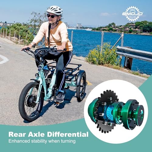 Safety Priority: EMOJO BULL Trike are certified to UL2849, it is for whole trike, ensures top-notch safety and performance standards, UL 2271 is only for battery 8.5 Lowest step through electric tricycle for adults seniors: EMOJO Bull trike stand over height is 8.5 , it is lowest, they are extremely easy to get on and off. They are a fantastic option for riders that don t have a complete range of motion, and are particularly great for older riders or riders who have a difficult time lifting their leg over a traditional bike frame Long Range electric trike: Range of 1pcs battery is 65 miles, 2pcs battery can reach up to 100 miles, but the optional secondary battery is not included in the package, please purchase it alone Electric trike with a differential will accelerate, corner, and brake more safely and stable: A differential avoids the single axle problem and ensures the trike corners well. When the Compass turns it grabs the corner, sending power to both wheels while still allowing the outside wheel to spin more quickly 7 Speed Gear make our e trike adapt to tricky terrain: A 7-speed bike is a great bike for a person who rides on tricky terrain. It s main purpose is to let the bike adapt to rough conditions and accommodate inclines, bumps and other difficulties. On a 7-speed bike, the lower gears make it easier to pedal and the higher gears allow for better movement going downhill, 7 speed has a lot more range than a single speed bike in terms of your pedaling EMOJO electric tricycle with rear basket: weight up to 100lb, convenient for shopping, trike basket are extremely useful for storing items like groceries