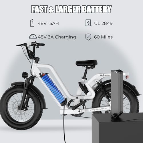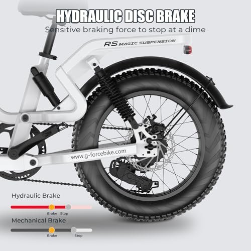REDUCE 90% OF ROAD DUMPS Reduce 90% of road bumps with G-FORCE s exclusive design! Our magic suspension includes 2 adjustable front fork shocks and 4 frame link shocks, offering an unprecedented silky smooth cycling experience. Perfect for daily commuting, cruising around town, and wild exploration! PEAK 1300W POWERFUL MOTOR Our electric bike boasts a stable 750W brushless high-speed motor with 85Nm of torque, enabling speeds up to 28mph and effortless climbs up to 35 . Paired with a professional 7-speed transmission, it ensures precise adaptation to all road conditions; FAST CHARGING & LARGE BATTERY RS electric bike features a 48V 15/25AH large capacity battery & 3.0A fast charing, offering a maximum range of 60-100 miles. Additional anti-theft measures also enhance security like the battery key lock and independent battery switch. Moreover, the RS is UL 2849 certified for safety; 4.0 ALL TERRAIN FAT TIRE The 20 * 4.0 fat tire electric bike is equipped with puncture-resistant knobby tires, the highly elastic rubber material and anti-skid pattern design offer excellent grip and gravel protection, making it suitable for dirt, snow, sand, and various terrains; STOP AT A DIME Equipped with large 180mm & 2.3mm rotors and hydraulic disc brakes, this system offers outstanding heat dissipation and responsiveness for rapid stops even in challenging conditions. Lightly apply pressure, and come to a halt instantly! Rear derailleur guard prevent struck or get bumps around in transit DURABLE 6061 ALUMINUM The reinforced 6061 aluminum frame ensures stable performance during long rides. IP65 waterproof and dustproof features withstand routine wear and tear. Plus, a wider rear rack supports up to 100 lbs of cargo, emphasizing quality and practicality; LIGHT UP YOUR JOURNEY Equipped with 48V LED headlights and bright rear lights, pedal and saddle reflectors ensure visibility even in darkness. An integrated electric horn alerts pedestrians and vehicles, enhancing safety during your ride! PROFESSIONAL SERVICE We provide a one-year warranty and lifetime technical support. Our ebike is 85% pre-assembly, you also can contact us for an installation video. If there s any issue with it, please don t hesitate to contact us