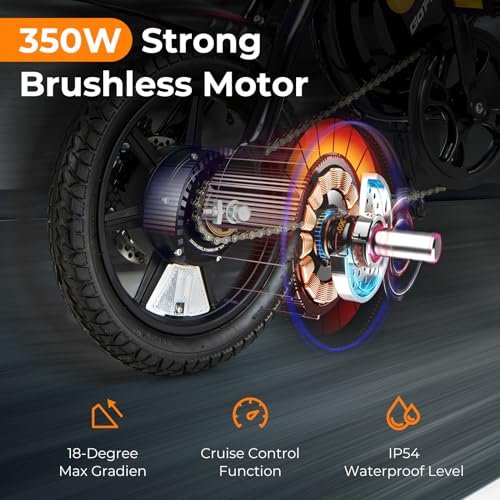 350W Powerful Motor & Battery Our adult electric bike is equipped with a 350W strong brushless motor and a 36V rechargeable lithium-ion battery to reach a speed of 15 mph and a distance of 20 miles. 3 Available Riding Modes This electric bicycle supports 3 working modes: normal bike mode, PAS mode and pure electric mode, satisfying your different needs of city commuting or leisure activities. Besides, you can achieve the cruise control function by turning the handle to a constant speed for 9 seconds. 90% Pre-assembled Design Different from other electric bikes, our e-bike is 90% pre-assembled, which is time-saving and energy-saving. What you need to do is to install the saddle, fender and 2 pedals. Then, you can enjoy the leisure riding. Absolute Safety & Night Riding To achieve optimum safety, the body of our product is expertly crafted using high-carbon steel material, known for its remarkable hardness and durability. Additionally, this electric bicycle is equipped with a high-brightness front light and rear light, prioritizing your safety during nighttime rides. Comfort Riding & Height Adjustable Seat The seat made of high-density sponge material, boasts exceptional softness and strong resilience, effectively combating hip fatigue resulting from prolonged driving. Moreover, our height-adjustable seat ensures suitability for individuals ranging from 4.6 ft to 5.8 ft. Reliable Riding Experience The 14 inches wheels with 2.1 wheel width adopt a rear mechanical disc brake and a convenient bike stand to ensure a safe stop. Meanwhile, our wear-resistant rubber wheels are designed with a lightweight aluminum alloy frame and wheel reflectors for a smooth and safe riding experience. Folding & Portable E-Bike With the folding latch, you can easily fold the handlebars and pedals for space-saving storage when not in use. Apart from that, the built-in carrying handle makes your transportation more convenient. (Two keys are included, one as a spare.)