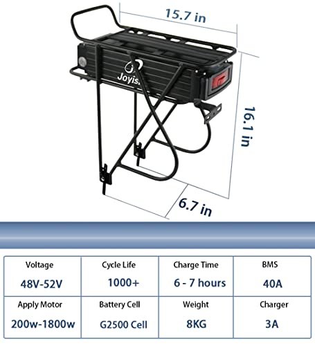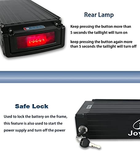Output 52V 20AH e-bike battery, Domestic 2500 battery cell, suitable for 1500W 1000W 750W 500W 350W 250W ebike motor, 40A BMS protection board, 2.5A charger. Comes with a pair of XT60 connectors with wires for battery end and controller end High Quality High quality imported electric core and equipped with a BMS protective plate, have overcharge, over discharge, over current and short circuit protection function ensure the long life expectancy Practical Design E-bike battery with taillight ensure you drive safely, and The battery indicator can inform you to charge in time. Sturdy aluminum shell, easy to transport and to take it. Modern shape design, easy to install and remove Battery Rack The E-bike Li-ion battery with a rack, it is very easy to assemble, and it fits for 24 26 28 wheel. The power switch and the use of the rack are all on the safety lock, please use the key to realize these functions Warranty Policy All our batteries enjoy one year warranty, we have professional technical team in US to offer after-sales service. Once there is any problem with the product, we can solve it