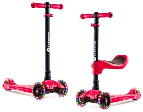 SCOOTING OPTIONS This 2-in-1 scooter gives your child the option to sit until they re confident enough to scoot while standing. The seat can be removed quickly and easily with a durable screw. DESIGNED FOR GROWING KIDS The handlebars can be set to 4 different heights. This accommodates usage for children as they grow older. SMOOTH RIDE With 3 wheels for extra stability, your child will be able to balance with ease. Plus, the deck is extra wide and has an anti-slip surface for increased support. LEAN TO STEER TECHNOLOGY Featuring Lean-to-Steer technology, this scooter is self-balancing. Instead of turning the handlebars, children can steer the scooter simply by leaning. This helps to develop their balance and coordination. FUN & EXCITING WHEELS The 3 wheels are equipped with multi-colored LED lights. As your child scoots, the wheels light up in a variety of twinkling colors. No batteries required!