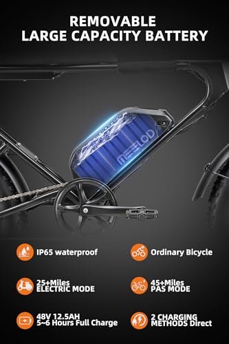 750W Powerful Brushless Motor Intelligence, efficient and safety are its core specials among ebikes. The adult electric bicycles with stronger brushless motor of ebike with lower no-load current, provides enough power for your daily travel and experience. Larege Capacity Removable Battery – The mountain ebikes for adults features a 48V/12.5Ah Removable High-Capacity Lithium Battery,It only takes 5-6 hours to charge. Two charging ways, charging on the bike or removing the battery for charging, don t worry about being stolen. Providing up to 28mph top speed and up to 45miles with pedal assistance range (25-mile range in pure electric) per full charge,making it suitable for long-distance commuting or outdoor exploration. Easy to Assemble – The commuting eBike comes with all the necessary tools and instructions for an easy and straightforward assembly process.This e-bike comes 85% assembled. It allows different sized riders to use the bike easily and improves overall comfort when riding on rough terrain. You can assemble it within 30 minutes and start your adventure right away. 3 working modes – A powerful beach ebike has 3 working modes: pedal assist mode, full electric mode and pedal mode. With one-year service for the electric motor, battery and other main replaceable parts(LCD display and controller), you ve no worry about using it. Versatile Terrain Adaptability&Safety First – Fat tire electric bike with its 20 x4.0 Fat Tire,this Electric Bicycle is adaptable to various terrains,such as snow,muddy,gravel,beach,mountain or flat road.The cruiser bike comes with an 12V LED integrated headlight, a LED rear light that illuminates the way forward,making it safe and visible for night riding. You can ride it in any season or weather condition with ease and confidence. Reliable After-Sales Support – Please keep the original package for a while, if you want to return mountain ebike, please contact us and we will send you a return label. Email: service77@meelod.com . Should you have any questions or concerns regarding installation on electric dirtbike, maintenance, or any other aspects, Also can contact with us. Our professional after-sales service team is dedicated to providing you with reliable support. Convenient Parts Replacement Design – We have designed replacement connectors for all electrical accessories for our adult ebike. If you need to replace the parts, you can replace it directly at the connector without opening the controller to find a complicated circuit. After-sales replacement of accessories is much more convenient. Premium Material – Our off road bike features a Carbon Steel ensures maneuverability and efficient cycling, while the Carbon Steel double-walled rims offer durability and a faster, drag-free ride. Classic Retro Design – DK200 city bike with an impressive retro frame design, combined with a modern electrical system, electric bike for adults is a true example of the classics, both stylish and retro. riding it is like stepping back in time to that exciting era.