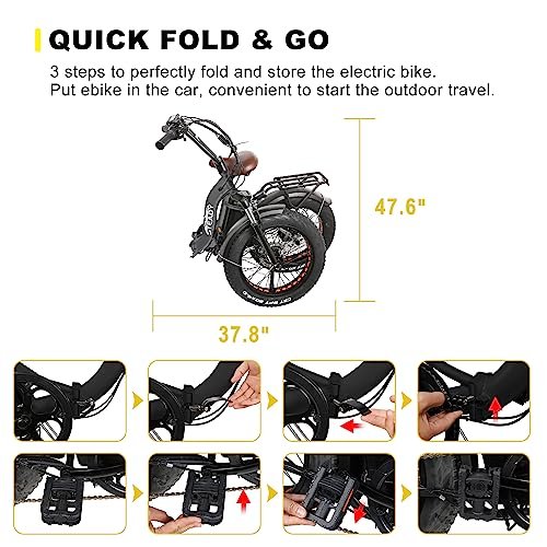 HIGH CAPACITY BATTERY The e-bike comes with a removable 48V 12AH lithium battery that charges quickly in just 4-5 hours. With this battery, you can enjoy an impressive range of 20-40 miles on a single charge. Its removable feature adds convenience, allowing for easy recharging or swapping, so you re always ready to go. POWERFUL MOTER With a peak 1000W brushless motor, this e-bike delivers exceptional power, reaching speeds of up to 25 MPH. The high-wattage motor provides rapid acceleration and an exhilarating speed experience, making it ideal for those who crave performance and efficiency on their rides. FRONT & REAR DISC Equipped with front and rear disc brakes and a 6-speed gear system, this e-bike adapts to various speeds and terrains effortlessly. Its high-profile horn and bright headlight enhance nighttime visibility and safety, ensuring a secure and smooth ride for all your adventures. FOLDING E-BIKE This foldable electric bike is designed for easy folding, making it perfect for tight spaces and easy to fit into a car, which enhances the convenience of your travels. 3 MODES OF OPERATION Pure electric bike, pedal-assisted electric bike and normal riding bike. In electric mode, pedaling or twisting the throttle accelerates the bike. You can choose pure e-bike mode to enjoy long trips without pedaling. Switch between the 3 modes to meet the needs of daily commuting, school, field, etc. for a more personalized riding experience. 1 YEAR CUSTOMER SERVICE We provide one year support period for our products. If any problem arises, please contact us for assistance. Our professional team will provide expert guidance within 24 hours to ensure that you receive prompt and reliable help. Ebike has UL2849 certification, so you can use our products with confidence. 500W Fat Trie Electric Bike 20 Eletric Bicycle for adlut 48V12A Lthium Battery 6-speed gear front and rear disc brake This 500W electric bike is equipped with a 48V12Ah lithium battery, which can be removed and charged separately, making it convenient to carry and charge. It takes about 4-6 hours to fully charge the battery, and the riding range can reach about 15-25 kilometers. This Ebike can be folded for easy traveling.The bike has a 6-speed gear and a front disc brake and rear disc brake, providing you with different riding experiences. The 20-inch bike is suitable for people between 145-180 cm in height, and the load capacity is about 150 kg. This electric bike is a good choice for commuting, mountain riding, leisure riding, and shopping.