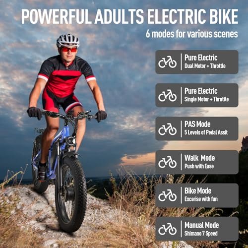 2200W Peak Powerful Dual Motor And 38MPH Top Speed Simple and atmospheric design, top-notch configuration, featuring a robust 52V 1100W peak motors ( total 2200W peak), bring you the pleasure of strong power. Top speeds 38 mph Remove speed limit , you can feel the strong wind beating against your cheeks, making every ride a free and exciting adventure, even if riding 37 steep hills is easy. Max 164 N.m torque tackle all terrains with confidence! Dual Front And Mid-mounted Shock Absorption System & 7 Speed Transmission Not only comes with lockable and adjustable front fork shock absorber, but also equipped with a racing-grade mid-mounted shock absorber, greatly reducing bumps during riding and improves riding stability and comfort. Besides, this professional 7-speed transmission system allows you to easily cope with rugged terrains such as mountains, rocks, rivers, and deserts. 52V 23Ah BMS Lithium Battery Equipped with a 52V 25Ah capacity removable battery, 26 *4 fat tire electric bike can travel up to 45-75 miles with pedal assist or up to 28 miles with electric power alone. Your journey length will adjust according to terrain and load, ensuring your exploration is endless. Battery can be fully charged in 4-8 hours, ready to explore this unknown and infinite again after a good night s rest. 26 * 4 All Terrain Tire And Dual Disc Hydraulic Brakes Our ebike adopt 26 *4 fat tires, ensure excellent stability and comfort across all terrains, such as snow road, sand road, gravel road. And the height of 26 tire is suitable for most adult men and women. Combined with dual hydraulic disc brakes, enjoy responsive and powerful braking even on steep slopes, rough terrain, or other extreme terrain. 95% Assembled And High Configuration All installation tools and manual comes in package. Please watch installation video on the page or manual. At last, fully accessorized with headlight, horn, phone holder, intelligent 3.5 LCD display, 2 pedals, adjustable saddle, mudguards, kickstand, and rear cargo rack. Ideal Present for Family The elegant and top-notch configuration is an ideal present for your family or friends. You will get the ebike within 3-7 working days after ordered, our ebikes deliver the package from US warehouse. Note: Please keep the original box for a perio. If you have any issues, pls contact us via email ,we ll respond to your inquiries within 24 hours.
