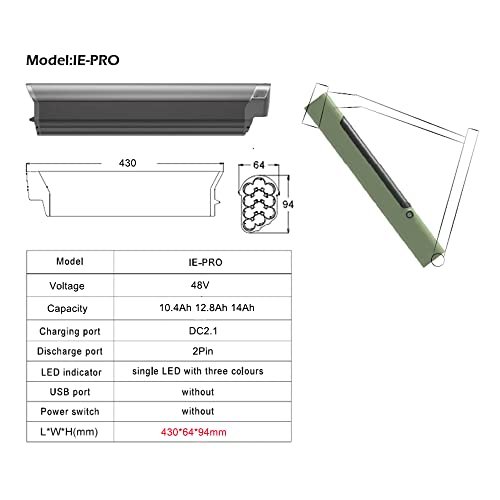 Features&Basic Parameters Primary dimensions:430*64*94mm(16.92*2.51* 3.70inch)!!This e-bike battery pack is 48V 14Ah 672WH,built in top A grade 3500mAh lithium-ion cells,composed Type:13Series 4Paralles(13S4P),recharge-cycle life up to 800+ times. Advanced Battery Management System Built-in 25A BMS protection board for using security ,it can protect the bike battery from the damages of short-circuit, over-current, over-charge, and over-discharge, to provides safety while in the electric bike battery running.Battery over 80% capacity after 800 cycles. Wide Compatibility This Reention EEL Pro Replacement ebike battery compatible with AVENTON Pace 500.2,Pace 500.3, Ride1up CORE-5/ LMT D,Magnum Summit / Cosmo Voyager/ Navigator X,NCM M3/T3/T3S/CRU3/CRU3S,iGo Core Series elite 3,and more. After-Sales Service Guarantee We are factory direct sales. All batteries enjoy 12 months warranty. .If you have any questions or suggestions about this product, please feel free to send us an email via Amazon Messages, and we will provide you with a good solution within 24 hours. Q&A Q:How to choose replacement battery A: Please kindly measure the dimensions of your old battery, if the dimensions are same as ours, then it fits your bike, if it is not same, it not fits. Compatible with the follow models Hilltopper Discover Vitesse Force MTB Aventon Pace 500.2 and 500.3 Magnum Summit Navigator Magnum Cosmo Voyager iGo Core Series elite 3 Leon Cycle NCM Moscow M3 Ride1 UP CORE-5 and LMT D ebike battery and more Attention: Before you place an order, please kindly measure the dimensions of your old battery, if the dimensions are same as ours, then it fits your bike, if it is not same, it not fits. Product Details: Battery Type: Lithium Battery Rated Voltage: 48V Rated Capacity:14Ah/672Wh Battery Size: 430*64*94mm(16.92*2.51* 3.70inch) Max Constant Discharge Current:25A( BMS) Battery Cell: top A grade 3500mAh lithium-ion cells Battery Charge Voltage: 54.6V AC input: 110-240V, 50/60HZ Charging Time: 5-8Hours Cycle Life: Over 800 times Package Included: * 1x 48V 14Ah/672Wh Battery with inbuilt BMS * 1 x 2A US plug Battery Charger(We will provide according to delivery country if without requested.) NOTE: 1. Due to manual measurement, the size will have an error of 1-3mm. 2. After receiving the battery, please charge the battery first, and then perform the test.