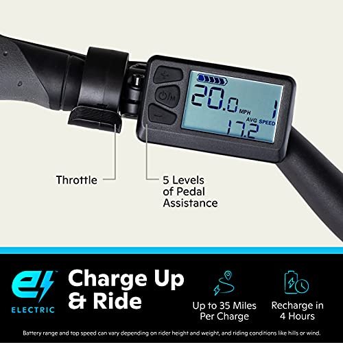 Hybrid ebike, 21 inch aluminum frame, perfect ebike for commutes, bike trails, or meeting friends, 27.5-inch wheel fit riders 5 8 to 6 4 inches tall Integrated downtube (288-watt) battery can last up to 35 miles on a single charge, includes charging cable, with 2 year warranty on battery & electrical system 250-watt hub-drive pedal assist motor that provides a quiet boost to accelerate up to 20mph with the throttle, tested to and complies with ANSI/CAN/UL2849 7-speed twist shifter offers smooth gear changes, mechanical disc brakes deliver all weather stopping power and alloy double wall rims with lightweight durability with 2.3-inch wide tires Integrated LED lights on the battery, head and taillights are sleek and help others see you on low light rides. The Marshall hybrid electric bike by Schwinn is built for everyday adventures. Visit friends across town or just go exploring you can do it all without worrying about long distances or steep hills. The Marshall features a 250-watt brushless geared hub drive pedal assist motor amplifies the effort you put into pedaling, up to 20 mph. Choose between several levels of assistance, or ride without it completely you re always in control. You can also use the throttle to accelerate without using the pedals, up to 20 MPH. The 288-watt hour internal downtube battery lasts for approximately 25 miles on a single charge, depending on conditions. Easily recharge in 4 hours with a standard household outlet and included charging cable. The battery also includes integrated LED lights that add to the sleek, modern look while helping others to see you on low light rides. Head and taillights are included for improved see and be-seen visibility. The Marshall also features an alloy frame for lightweight durability, 7-speed twist shifters, and mechanical disc brakes. Plus, 2.3-inch-wide wheels with alloy double wall rims offer superior durability without weighing you down. Power up your adventure with the Marshall by Schwinn.