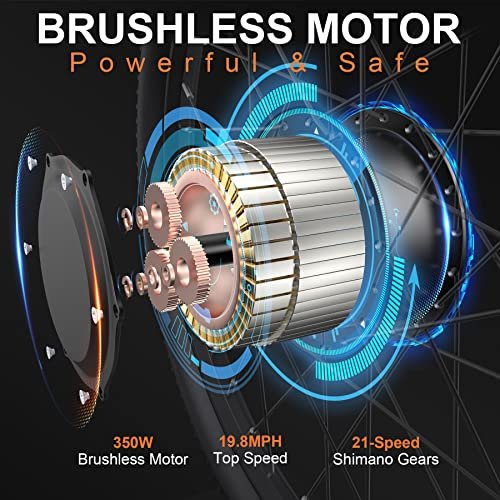 POWERFUL MOTOR&LITHIUM BATTERY: The electric bike for adults adopts a 350W high-speed motor, producing a top speed of up to 19.8MPH. With a 36V 374.4AH removable IPX5 waterproof Lithium-Ion battery, fully charged in 5 hours, this ebike is capable to achieve 28-30 miles in full electric mode and 50-60 miles in pure pedal assist mode (PAS mode). Your mountain adventure and daily commute will be faster and more cost-efficient. FRONT SUSPENSION&DUAL DISC BRAKES: The adult electric bicycles employ a lockable front suspension fork. Its strong shock absorption helps you pass rough terrain with less effort. Together with the front and rear mechanical disc brakes, gives you reliable braking force and sufficient stopping power in steep descents, bumpy roads or other extreme condition. Both offer you a smoother and safer riding experience. RELIABLE BIKE CONFIGURATION: 26 ebike frame is made of high-quality Aluminum Alloy, lightweight, solid and durable. Shimano 21-speed transmission system will satisfy all your speed needs for uphill, downhill, acceleration, deceleration, and steady speed. This electric mountain bike also comes with an LED headlight, making you visible and safe at night. The intelligent LCD display keeps track of real-time speed, battery level, pedal assist level, mileage and other stats. 4 WORKING MODES: Throttle Ebike & Assisted Bicycle & Normal Bike & Booster Mode. With the LCD 3-speed smart meter button, you can choose the electric assist level according to your needs. You can also add a burst of speed with the throttle to avoid traffic lights. Booster mode allows the ebike to travel at 3.73 miles/h depending on the road conditions, easy to push the e bike uphills. Combining 4 modes of this electric bike would be a better choice for long-time trips and workouts. ASSEMBLY & CUSTOMER SERVICES: This electric bike comes 85% assembled. The assembly video and upgraded manual are on the product page. Please inflate both tires for the first ride. Electric bicycle weight 45 lbs, max load 300 lbs/135kg, recommended height: 5.3-6.1ft. 1-year warranty for the ebike parts is covered. If you have any problems with the adult electric bike, please be free to contact us.