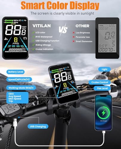 Lightweight & Foldable The VITILAN V3 2.0 folding electric bike for adults features a lightweight and durable 6061 aluminum alloy frame, weighing only 69LBS with a maximum load capacity of 330LBS. This adult foldable commuter e-bike is easy to carry and store, solving the troubles of crowded subway, traffic jam, no parking space and so on. This adult electric bike is ideal for urban commuting, school, traveling, or outdoor adventures. The folded size is 41.34 30.51 (105 77.5cm). 1200W Peak Power Motor The ebike for edults is equipped with a powerful 750W brushless rear hub motor, this e-bike for adults can reach a top speed of 28mph with a torque of up to 80NM. This foldable electric bike is capable of conquering 35 slopes with the 750W motor and Shi-mano 7-speed gears can add climbing power. 13AH Removable Lithium Battery Our electric bicycle for adult has a high-capacity 48V 13Ah (624WH) removable lithium battery, it can ride up to 30 miles in pure electric mode and up to 50 miles in Flat Road Assist Mode. The full charge time is only 5-6 hours. Intelligent LCD Display & Cruise Control Our folding e-bike for adult offers 5-speed electric pedal assist and multiple riding modes (Pure Electric, PAS Mode, Cruise Control, Pedal and Walking Mode). The color LCD display provides accurate information on battery level, speed, mileage, and riding mode for a wonderful riding experience. 20 *4.0 All-Terrain Fat Tires The 20 inch fat tire electric bike for adults features high-quality CST brand tires that are puncture and skid resistant, wear-resistant, and suitable for all kinds of rugged road surfaces. The suspension fork with spring technology provides a comfortable riding experience, and the dual mechanical disc brakes ensure safety by reducing braking distance. Safety Lights & USB Chargeable The adult fat tire ebikes light, rear taillight, wheel reflectors, and a horn for night riding safety. The bike also features a USB port for charging your phone.